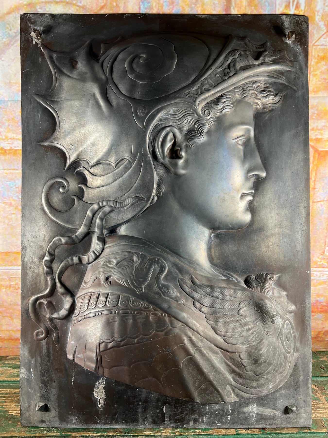 Ce superbe relief en métal patiné, réalisé à la fin du XIXᵉ siècle, représente la noble silhouette d’Athéna, déesse de la sagesse et du courage.