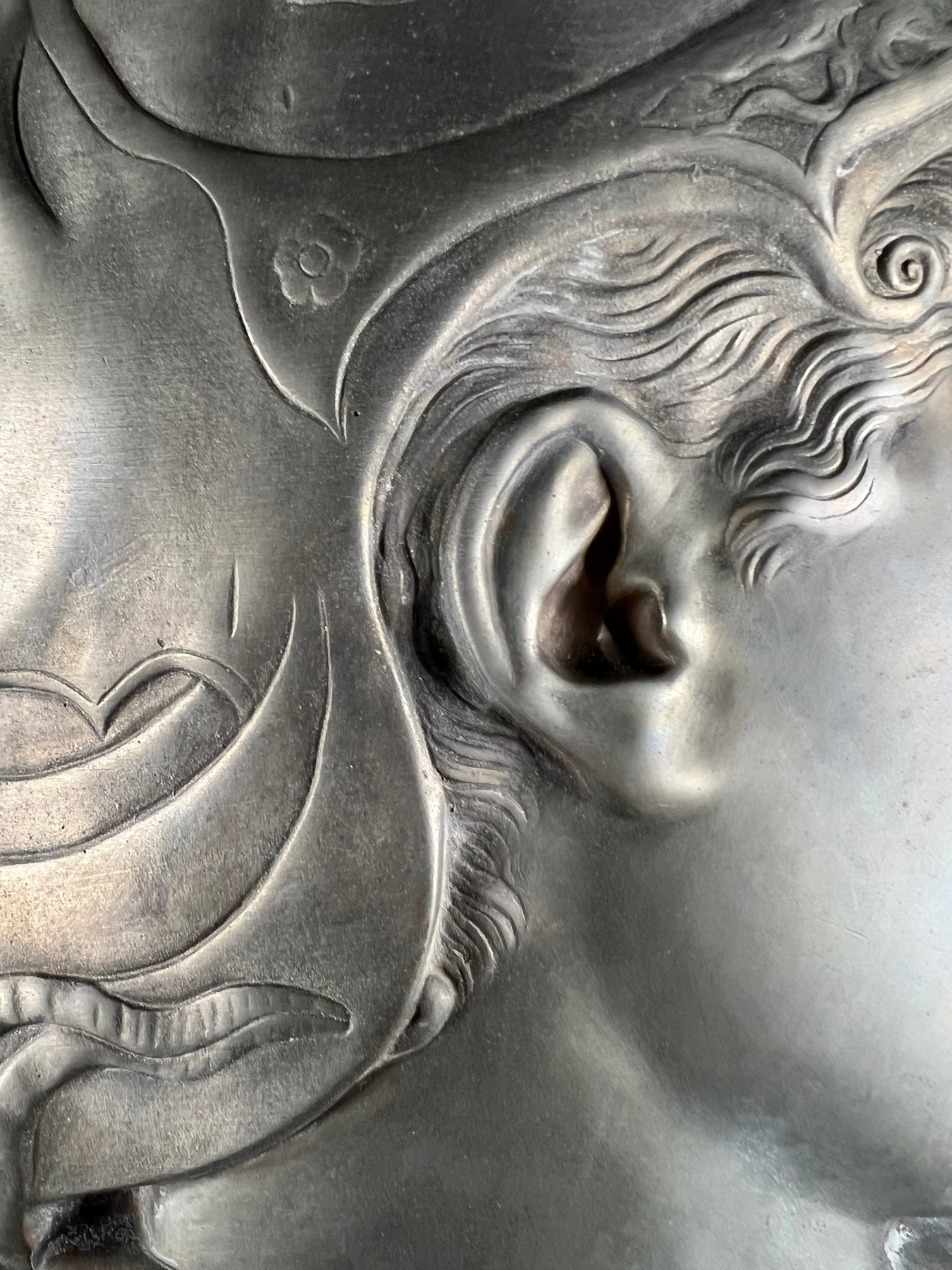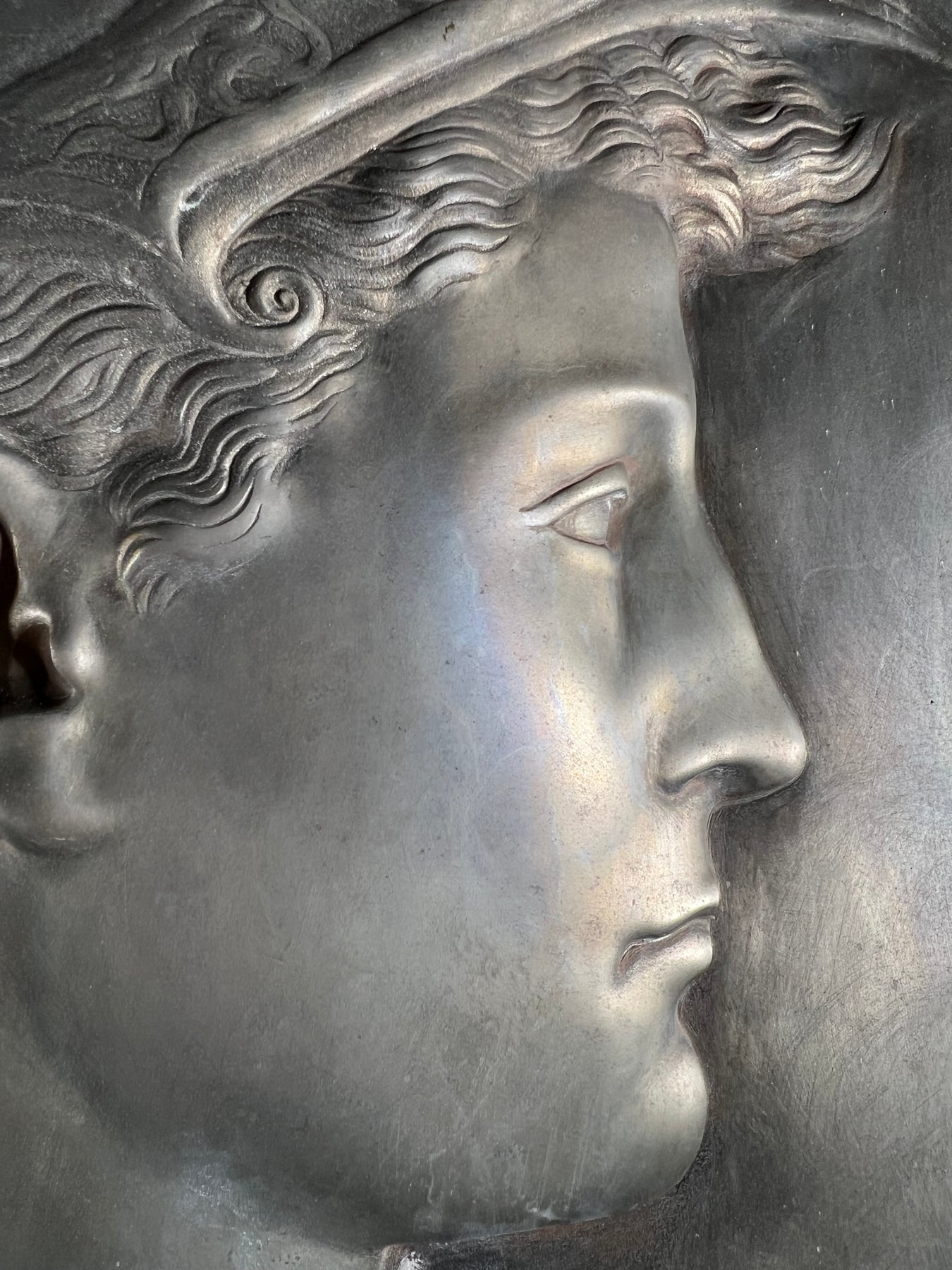 Le profil droit, serein et déterminé, se découpe avec force dans un jeu d’ombres et de lumière propre au métal repoussé. Son casque orné, son regard calme et les plis nerveux de son drapé confèrent à la composition une présence majestueuse.